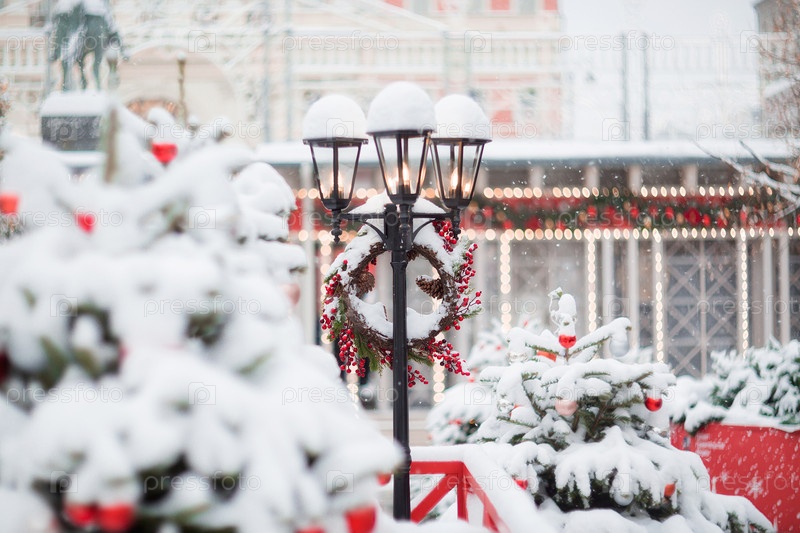 Новогоднее оформление Тверской улицы в классических красно-зеленых тонах. Красивые праздничные городские пейзажи Москвы. Украшенные елки и снег
