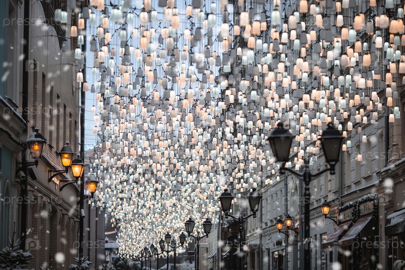 Рождественские украшения. Красивые праздничные пейзажи Москвы. Столешников переулок украшен красивыми фонарями. Россия