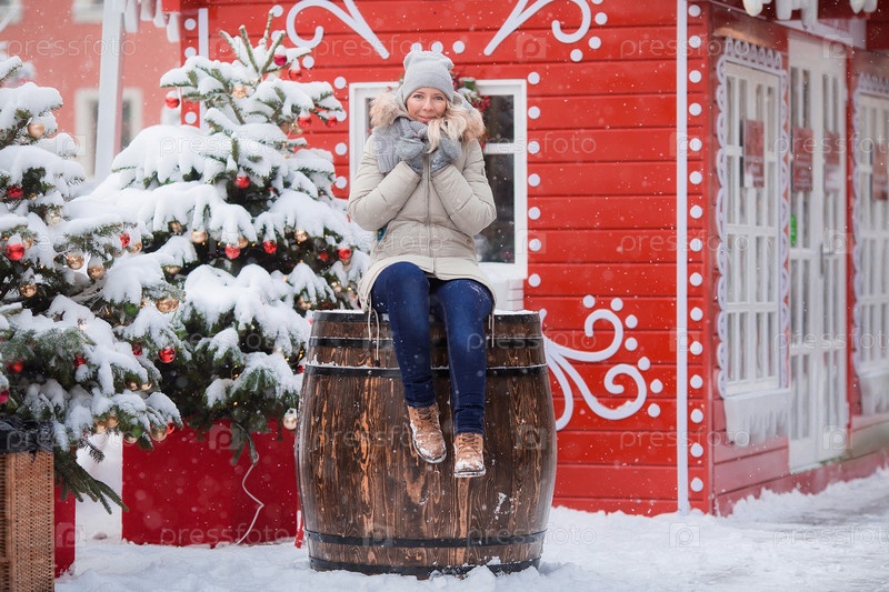Девушка идет по Тверской улице, украшенной к Рождеству в классических красно-зеленых тонах. Красивые праздничные городские пейзажи Москвы. Украшенные елки. Снег падает