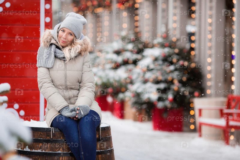 Девушка идет по Тверской улице, украшенной к Рождеству в классических красно-зеленых тонах. Красивые праздничные городские пейзажи Москвы. Украшенные елки. Снег падает