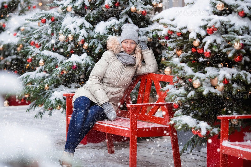 Девушка идет по Тверской улице, украшенной к Рождеству в классических красно-зеленых тонах. Красивые праздничные городские пейзажи Москвы. Украшенные елки. Снег падает