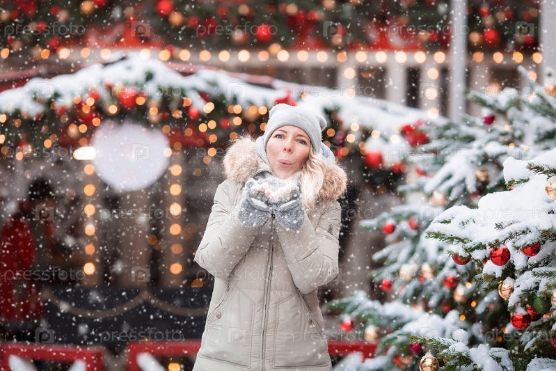 Девушка идет по Тверской улице, украшенной к Рождеству в классических красно-зеленых тонах. Красивые праздничные городские пейзажи Москвы. Украшенные елки. Снег падает