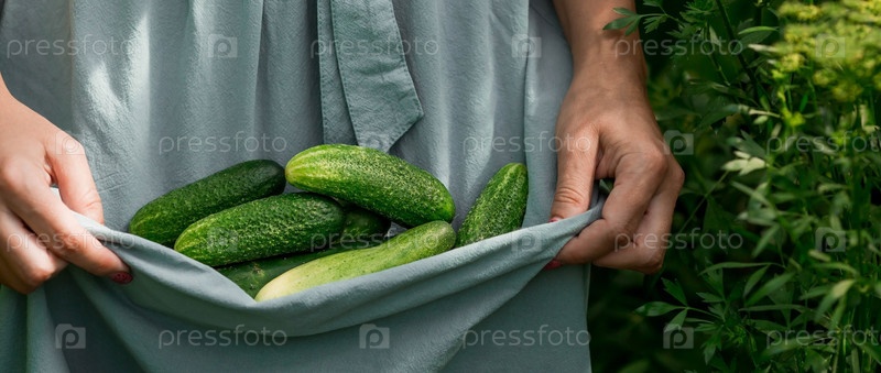 Руки девушки с плетеной корзиной крупным планом. Фермерша в хлопковом фартуке держит огурцы. Концепция сбора урожая в теплице