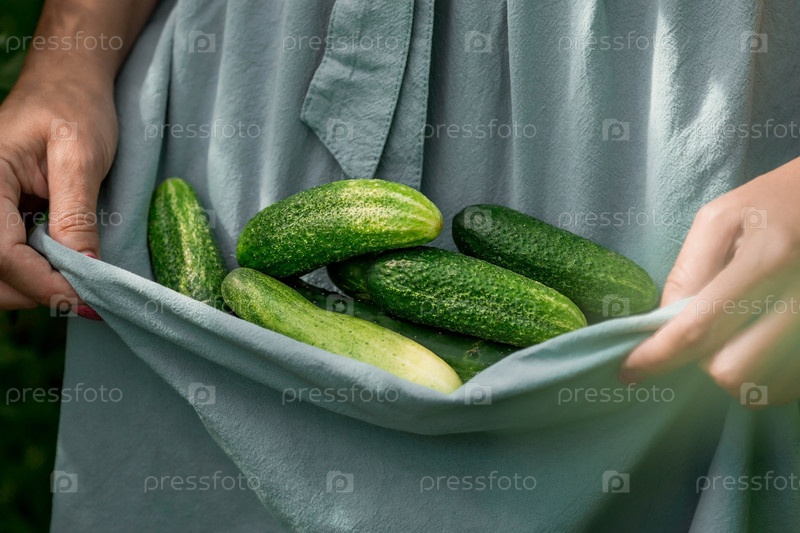 Руки девушки с плетеной корзиной крупным планом. Фермерша в хлопковом фартуке держит огурцы. Концепция сбора урожая в теплице