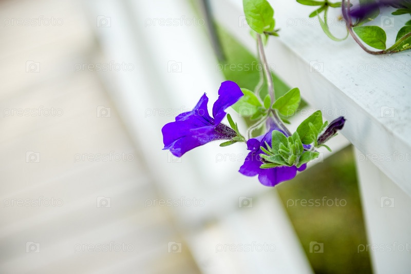 Цветок петунии на белом деревянном крыльце