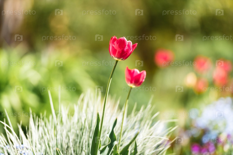 Красные тюльпаны на зеленом естественном фоне