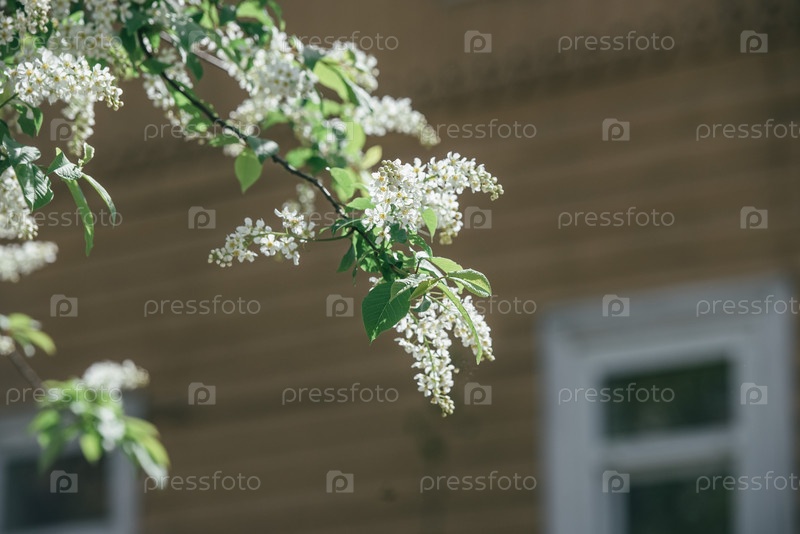 Ветка цветущей вишни на фоне деревенского дома