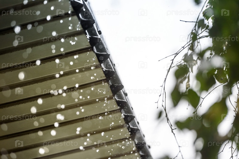 Дождь стекает с крыши. Крупный план. Сезон дождей