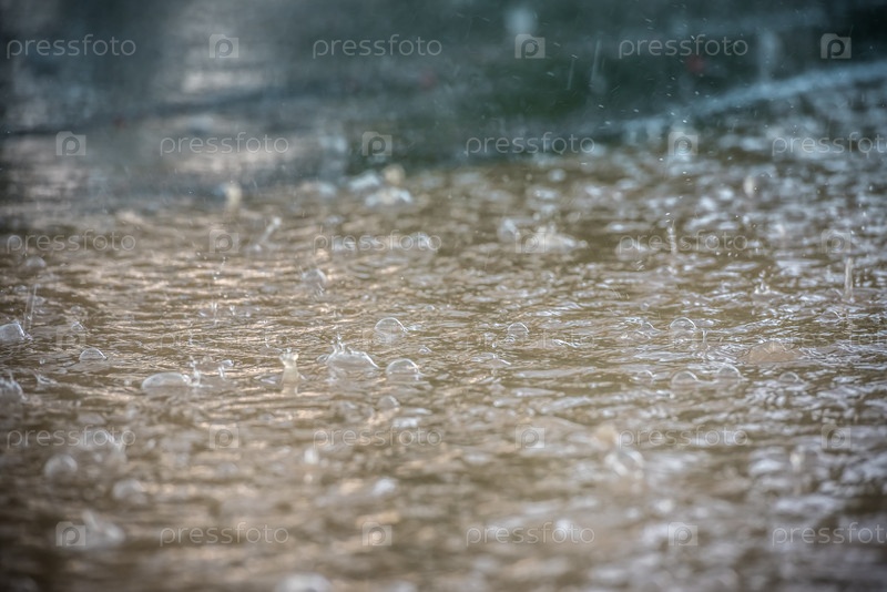 Ливень в летний день. Капли дождя и брызги в луже на асфальте