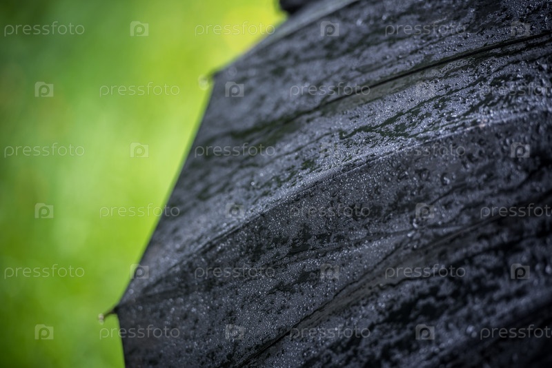 Большой черный зонт в дождь падает на фоне зеленой травы. Крупный план