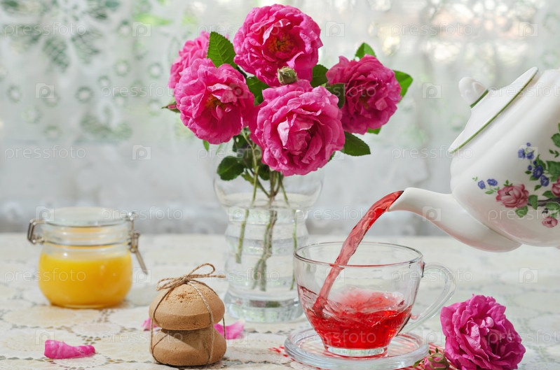 Из чайника наливается чашка горячего цветочного чая, рядом печенье, мед и розы. Выборочный фокус