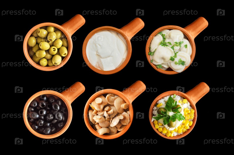 Различные закуски в керамической посуде, изолированные на черном фоне