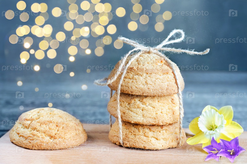 Печенье, перевязанное веревкой, на синем фоне с цветами и боке. Выборочный фокус