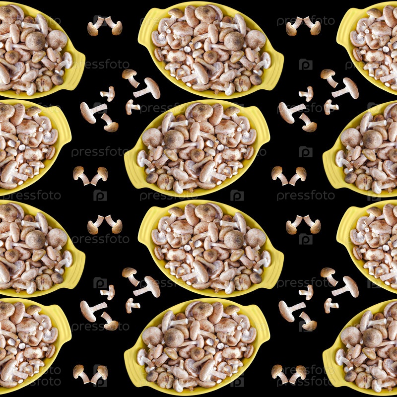 Сырые свежие лесные грибы в жаровне, на фоне черного квадрата. Бесшовный узор
