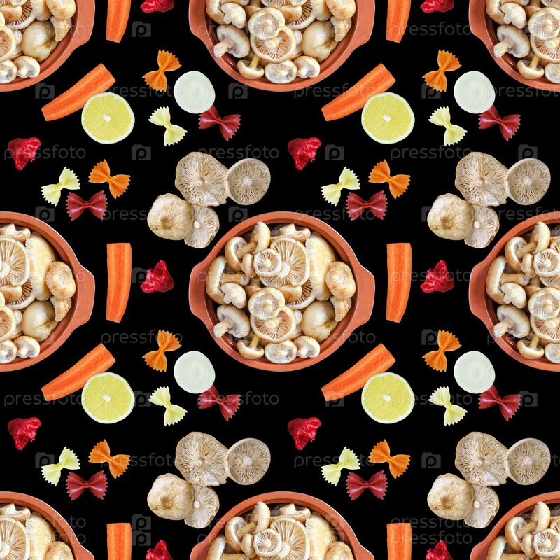 Бесшовный рисунок с сырыми свежими грибами в кастрюле, пастой и овощными ингредиентами для приготовления пищи на черном квадратном фоне