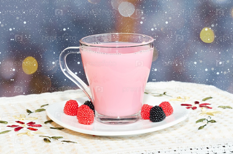 Рождественский или новогодний безалкогольный коктейль с ягодами и сливками для детей. Праздничный фон боке