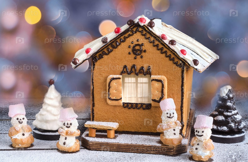 Рождественский торт в виде домиков, шоколадных елок и милых снеговиков