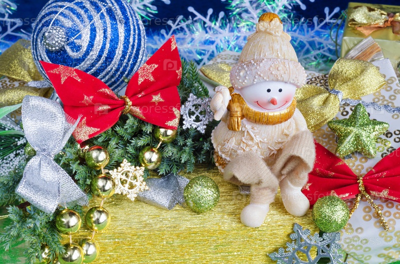 Рождественская композиция. Веселый снеговик на подарке и украшениях