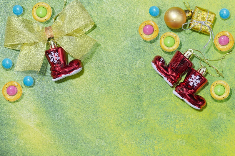 Рождественские украшения, конфеты и крендельки на зеленом деревянном фоне