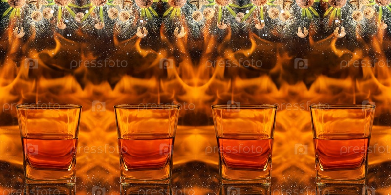 Баннер с бокалами виски и горящим огнем на заднем плане. Наложение новогоднего фона