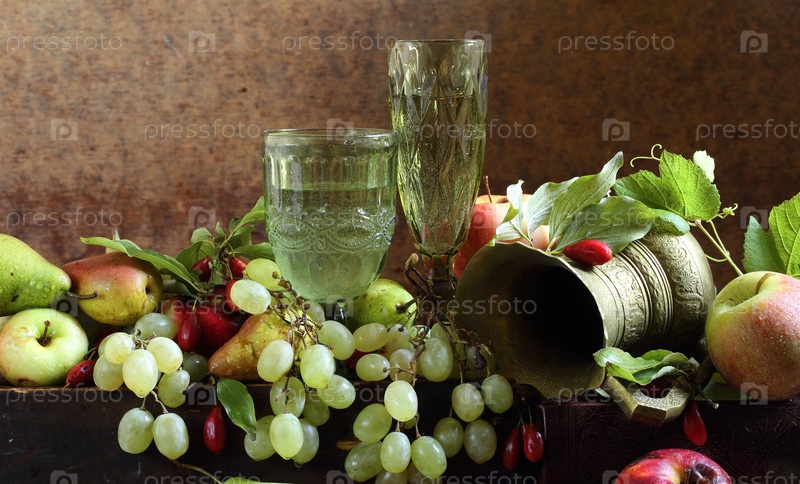 Натюрморт с белым вином,яблоками,грушами,виноградом и кизилом на коричневом фоне