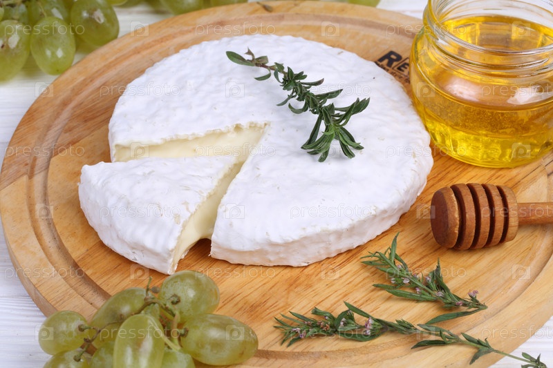 Камамбер с медом и виноградом на белом фоне