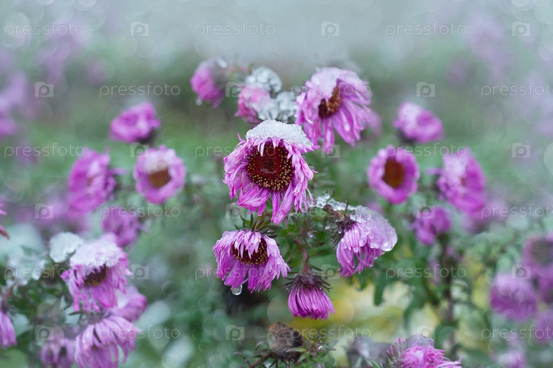 Осенние цветы покрыты первым тающим снегом. Выборочный фокус, несфокусированный фон