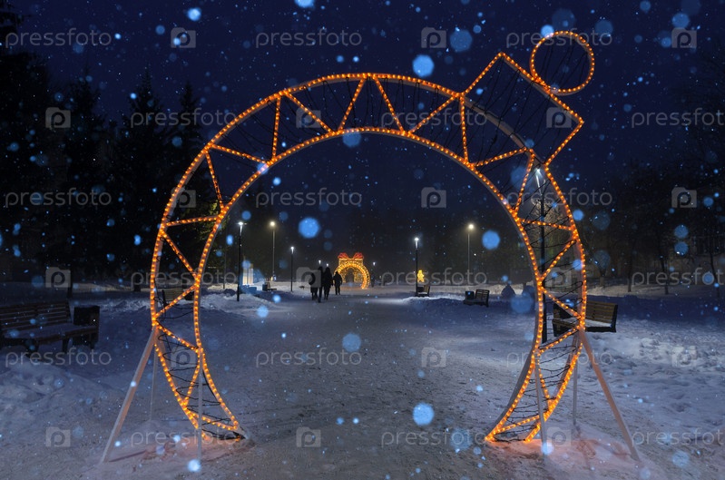 Освещенные арки, на аллее зимнего города в снегопад