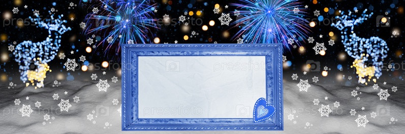 Снежный пейзаж с текстовой рамкой, фейерверком, боке в виде оленя. Широкоэкранный расфокусированный фон, художественный дизайн