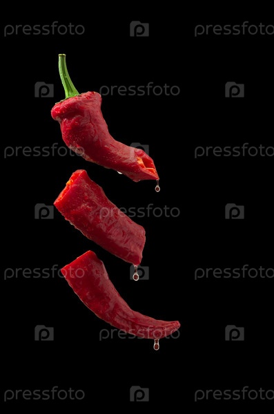 Острый перец чили нарезанный и капающий, изолированный на черном фоне