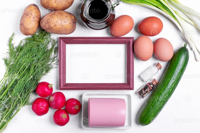 Ингредиенты для приготовления холодного супа Окрошка. Колбаса, редис, картофель, огурец, яйца, квас, травы и специи вокруг рамки на белом столе. Вид сверху