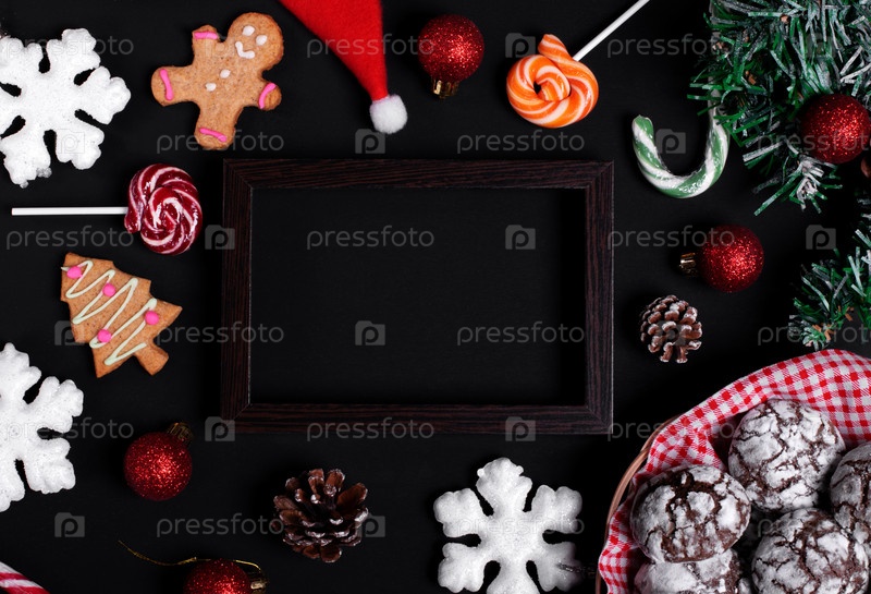 Темный рождественский фон с копией пространства. Праздничные десерты и украшения на черном столе. Пряники, корочки, леденцы, безделушки, снежинки, шишки, шляпа Санты и венок