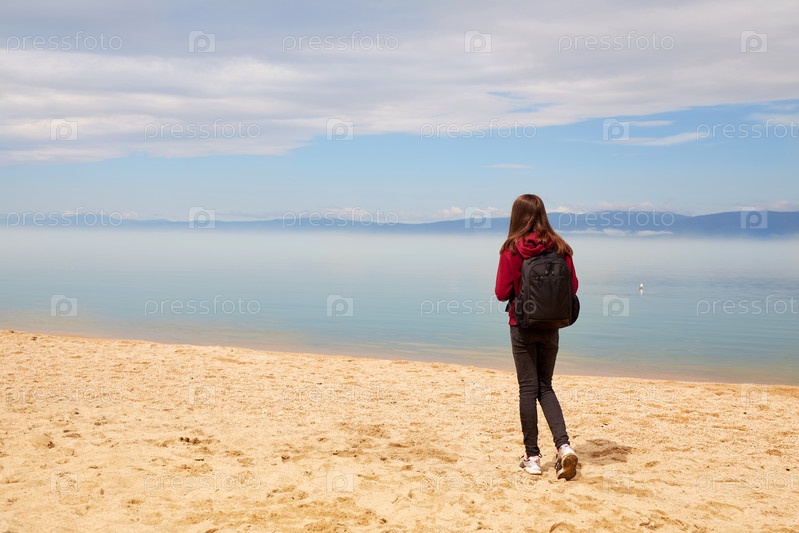 Девушка наслаждается прекрасным видом на спокойное озеро Байкал летом