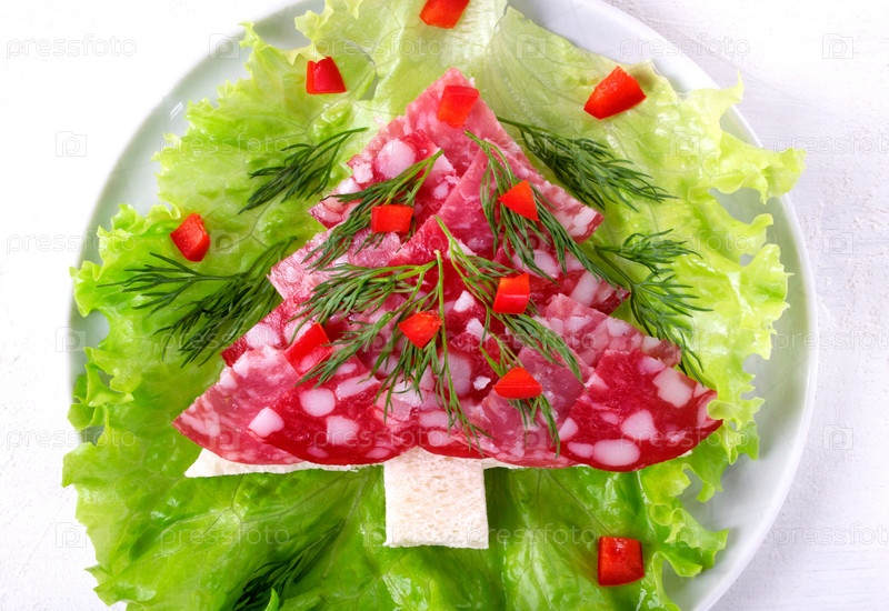 Канапе, елка, с салями на пшеничном хлебе с укропом и перцем на листе салата. Вид сверху. Праздничная закуска. Сервировка новогоднего стола