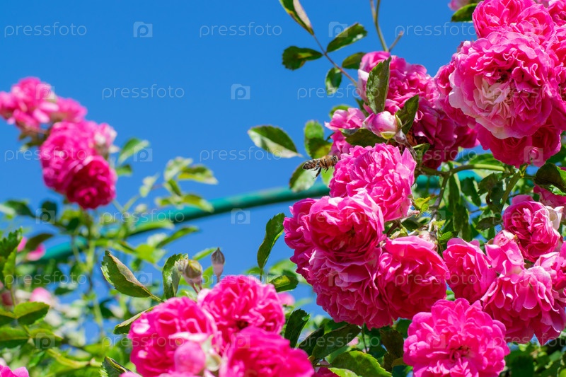 Розовая плетистая роза и пчела летают на фоне голубого неба в солнечный день