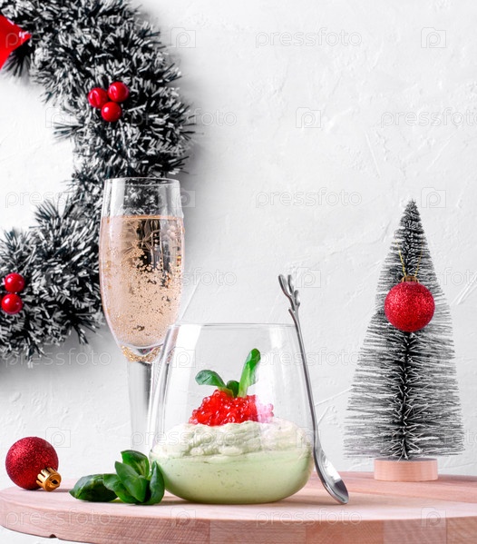 Мусс из авокадо со сметаной и красной икрой и бокал шампанского подается на деревянном столе. Изысканная рождественская закуска. Сервировка новогоднего стола