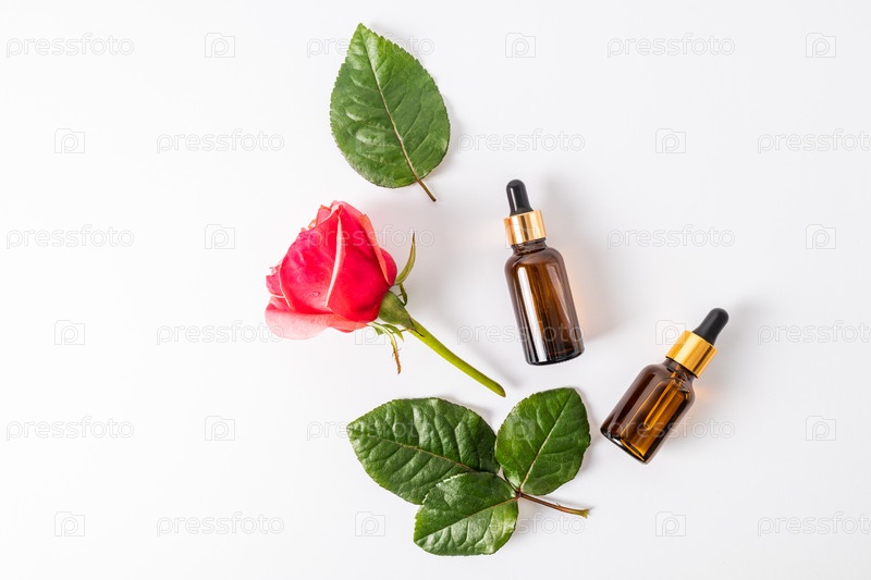Косметические флаконы из янтарного стекла с капельницей на белом фоне с бутоном розы и листьями. натуральная косметика. средства по уходу за кожей