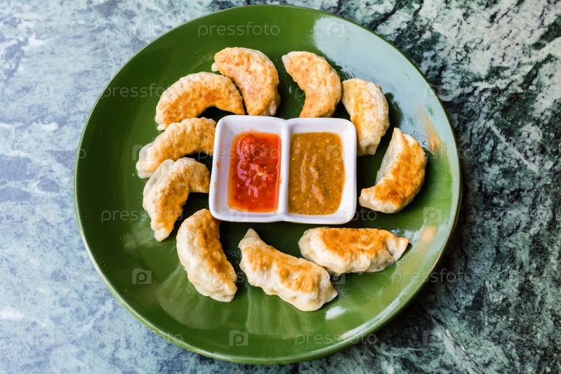 Жареные непальские клецки момо с томатным чатни. Традиционная азиатская еда