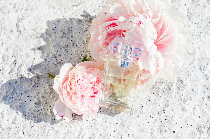 Стеклянная бутылка женских духов или туалетной воды лежит на розовых пионах и сером бетонном фоне. концепция парфюмерии и красоты