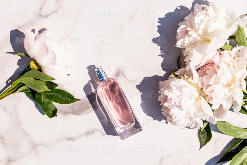 Шикарный флакон женских духов или спрея на фоне белого мрамора среди свежесрезанных пионов. вид сверху. понятие парфюмерии и красоты