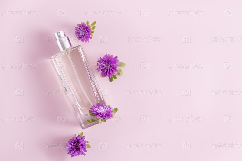 Красивая бутылка женских духов или косметический спрей на розовом фоне среди осенних цветов. пространство для копирования. Пустой макет. презентация аромата