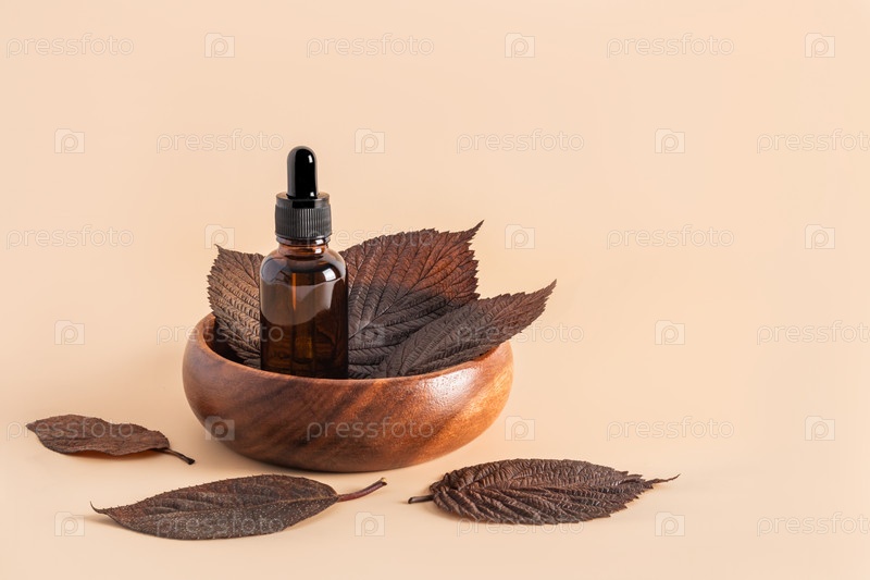 Антивозрастная сыворотка или косметика в стеклянной бутылке с пипеткой в деревянной миске с коричневыми листьями на бежевом фоне. передний план