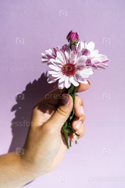 Букет фиолетовых хризантем в руке на фиолетовом фоне, вид сбоку