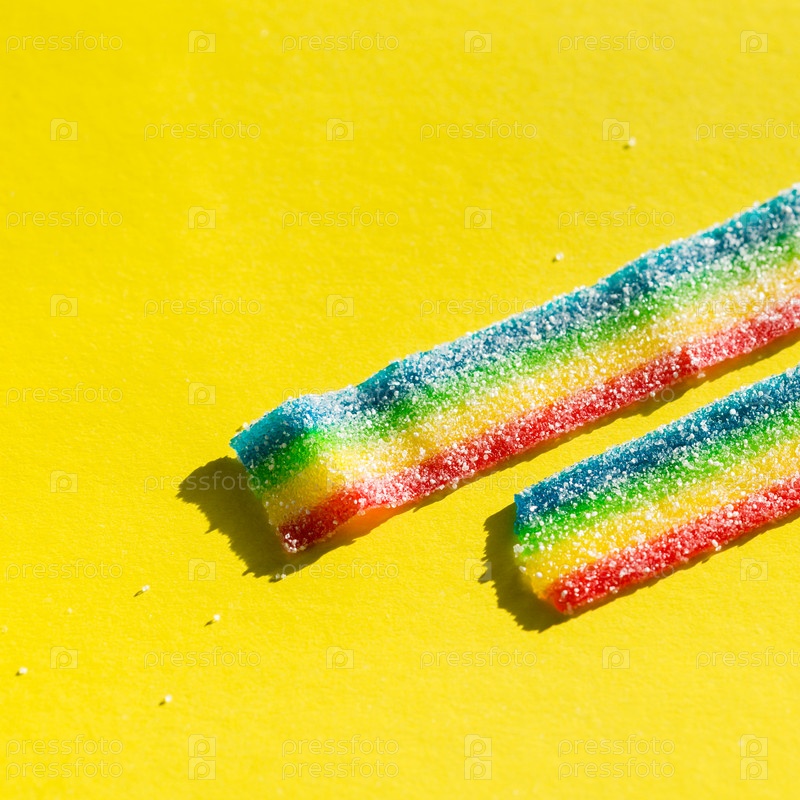 Полосатый, красочный мармелад в сахаре на желтом фоне. Мармеладные конфеты радужного цвета. Скопируйте пространство, пустой шаблон для текста