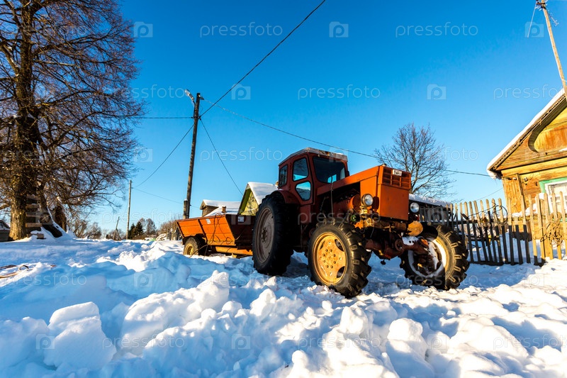 Старый трактор убирает снег зимой на улице традиционной русской деревни