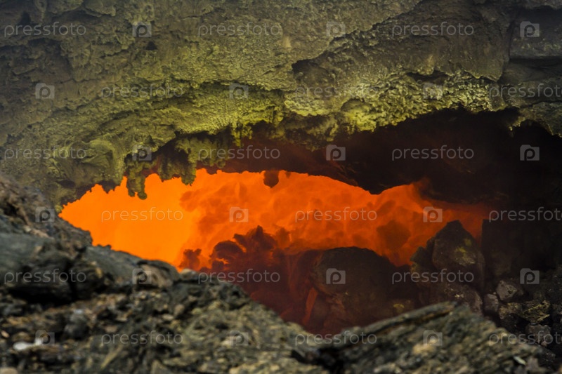 Извержение вулкана Толбачик, кипящая магма, протекающая по лавовым трубкам под слоем твердой лавы, полуостров Камчатка, Россия