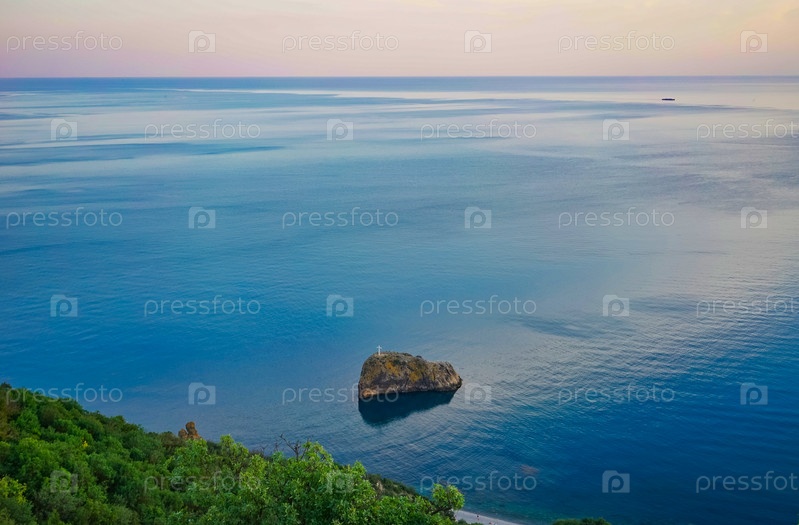 Морской пейзаж с береговой линией, покрытой растительностью