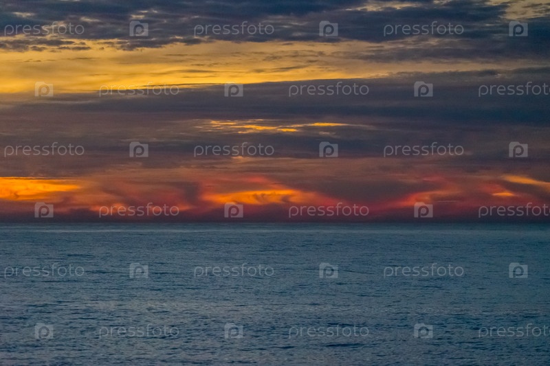 Яркий драматический закат с оранжевыми полосами в вечернем небе над морем