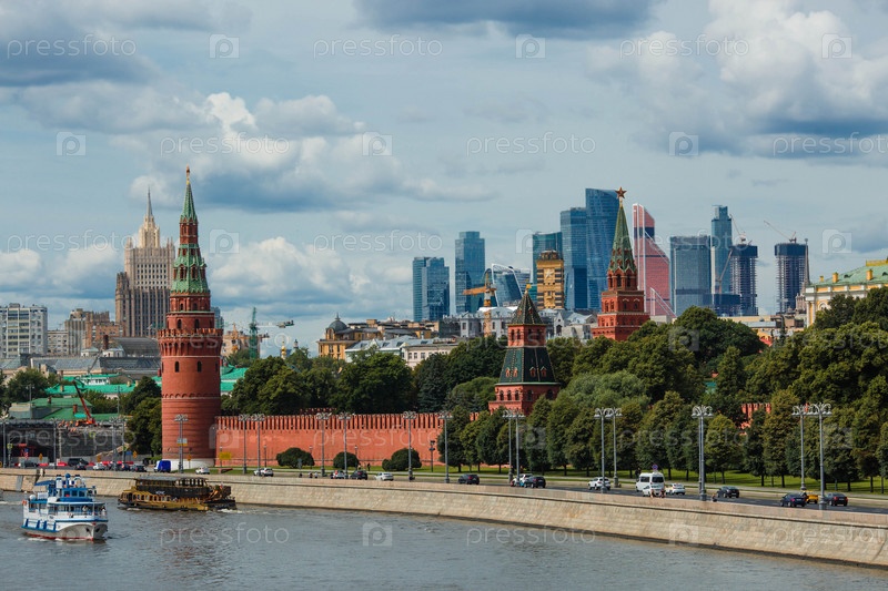Вид Москвы в летний день. столица России. Большой Кремлевский дворец. Церковь Кремля. Кремлевская набережная. река Москва. Популярная туристическая достопримечательность. Визитная карточка Москвы