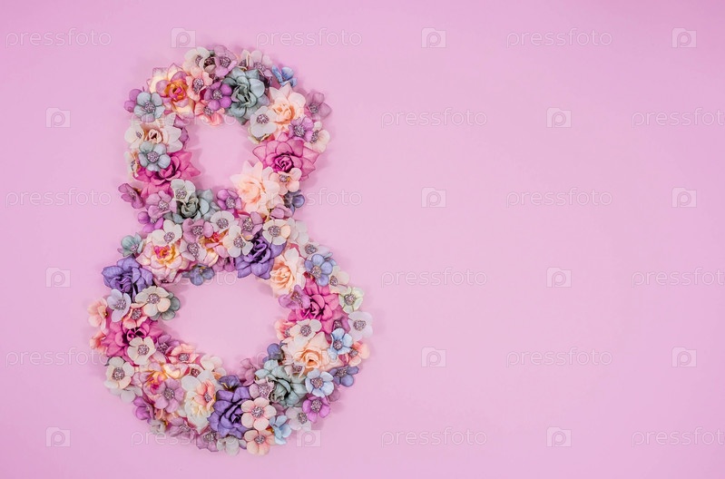 Международный женский день. Баннер, флаер, красивая открытка на 8 марта. Цветы и бабочки в форме цифры восемь на розовом фоне